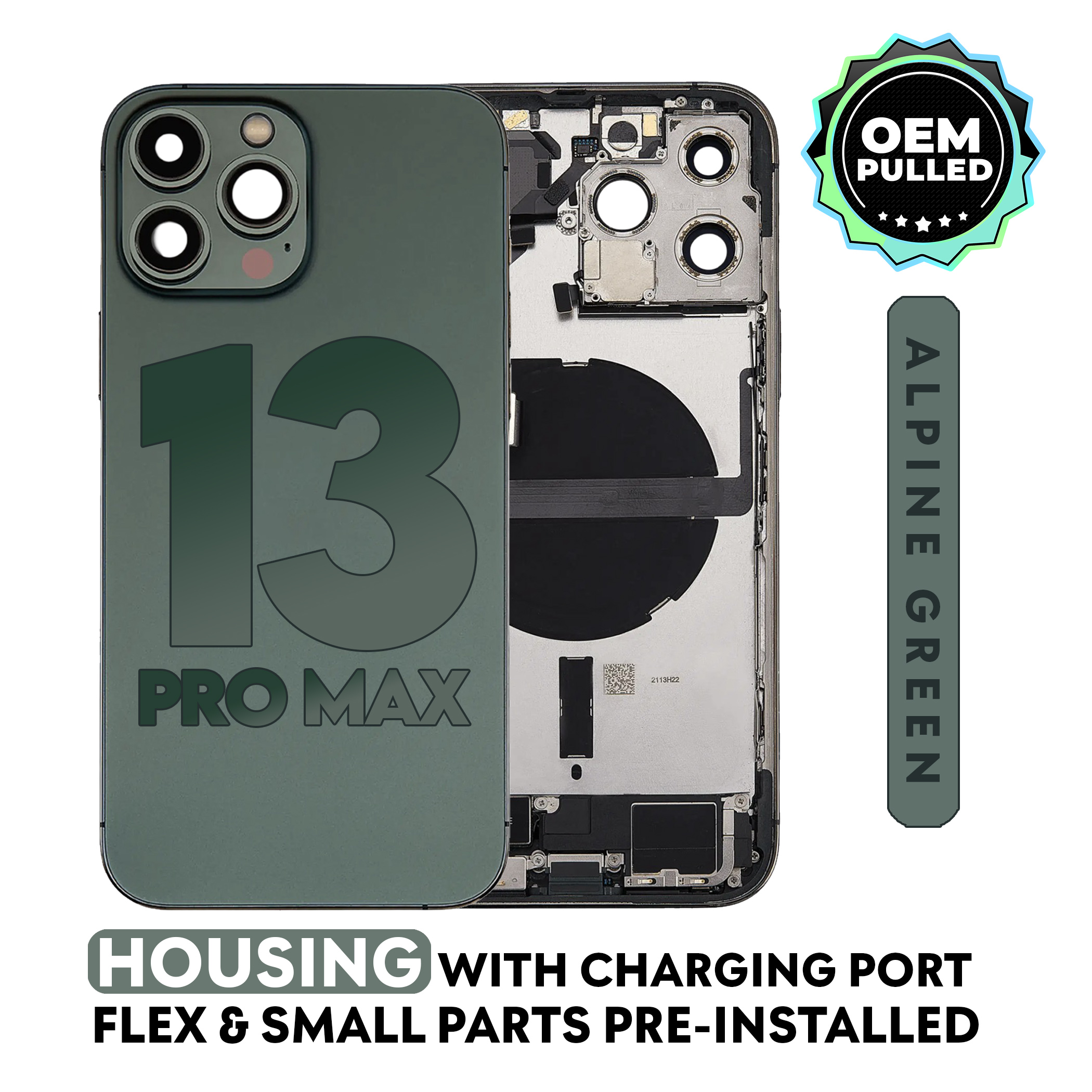 iPhone 13 Pro Max | (OEM Pull: Grade B) (Alpine Green) Back Housing W/ Charging Port Flex & Small Parts