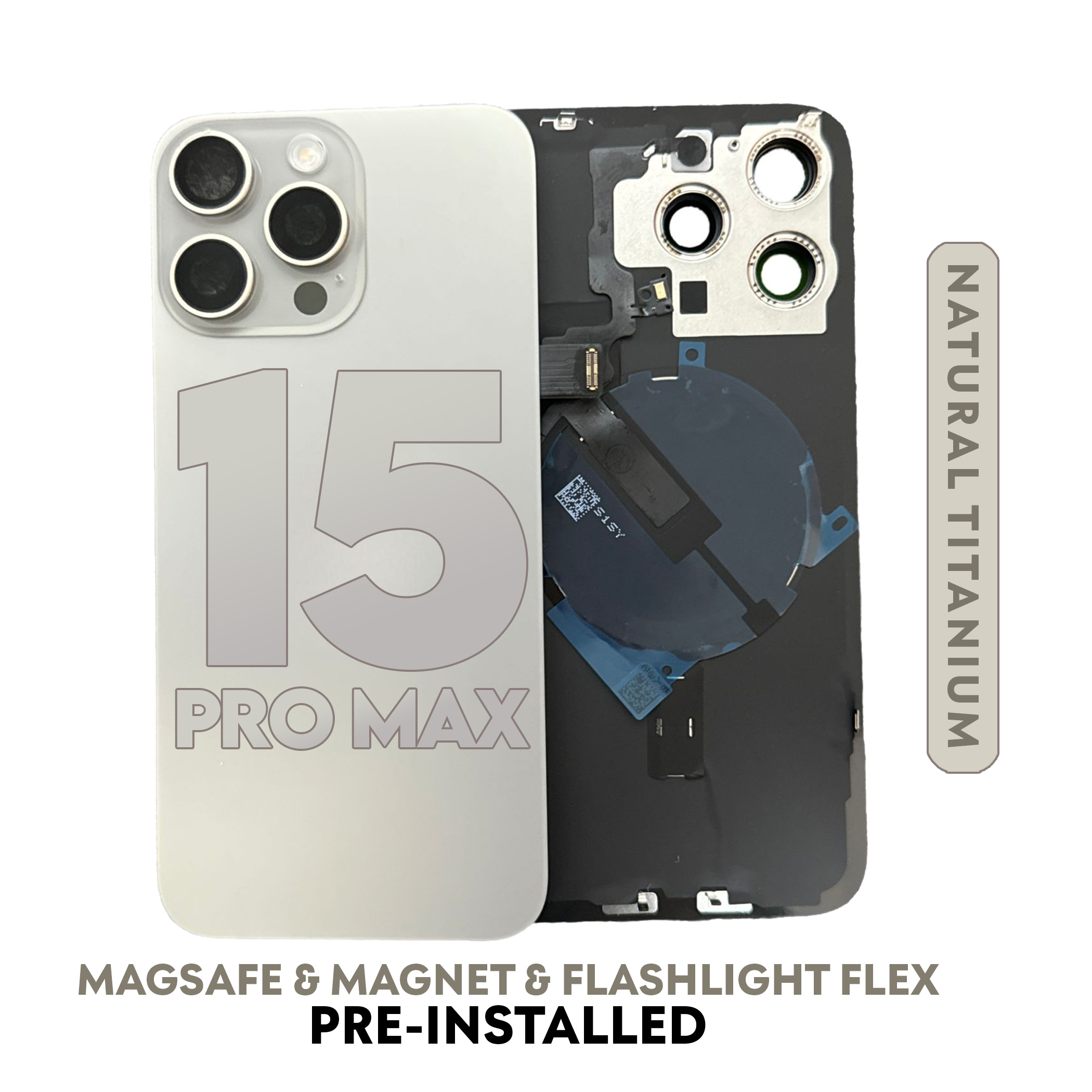 iPhone 15 Pro Max | Back Glass With Magsafe & Magnet & Flashlight Flex Pre-installed (Natural Titanium) (No Logo)