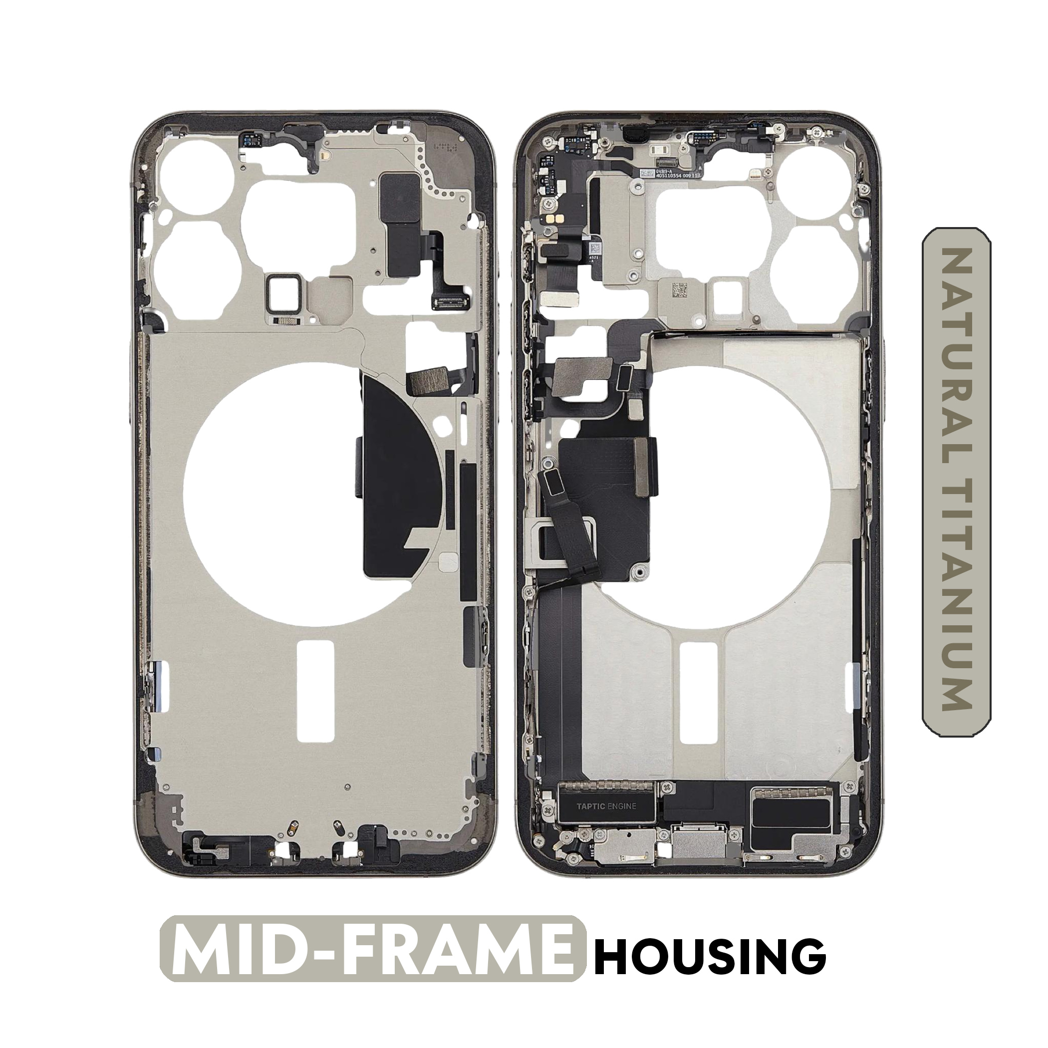 iPhone 15 Pro Max (US Version) (Used OEM Pull: Grade B) (Natural Titanium) Mid-Frame Housing W/ Charging Port Flex & Small Parts