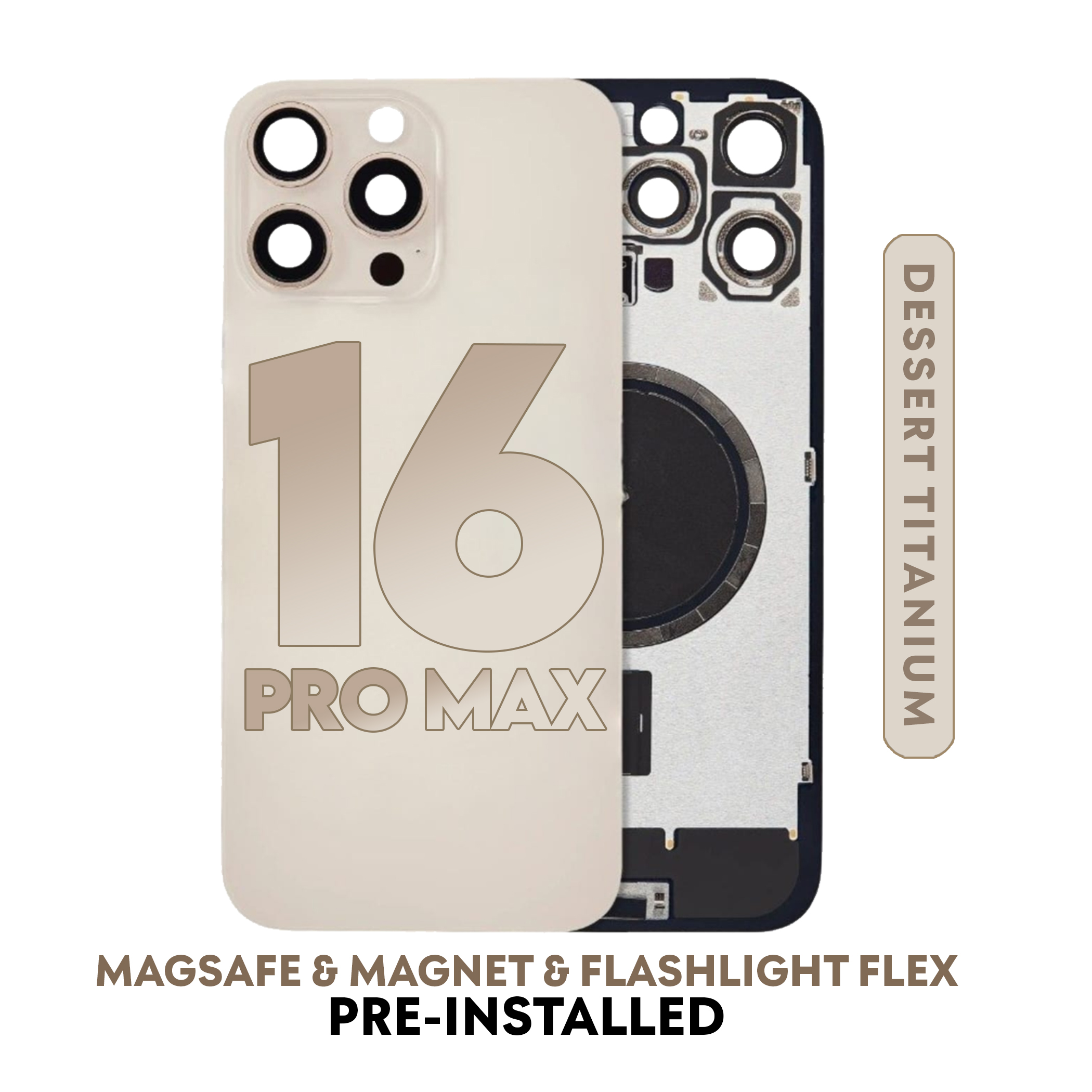iPhone 16 Pro Max | Back Glass With Magsafe & Magnet & Flashlight Flex Pre-installed (Dessert Titanium) (No Logo)